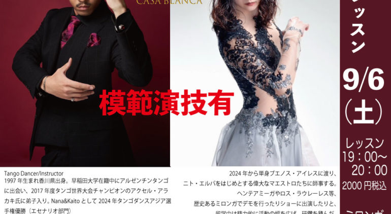 KAITO氏2回目のレッスンです。是非アジアチャンピオンのレッスンを受けてください。ミロンガではSAKURAKOとのデモがあります。お見逃しなく!